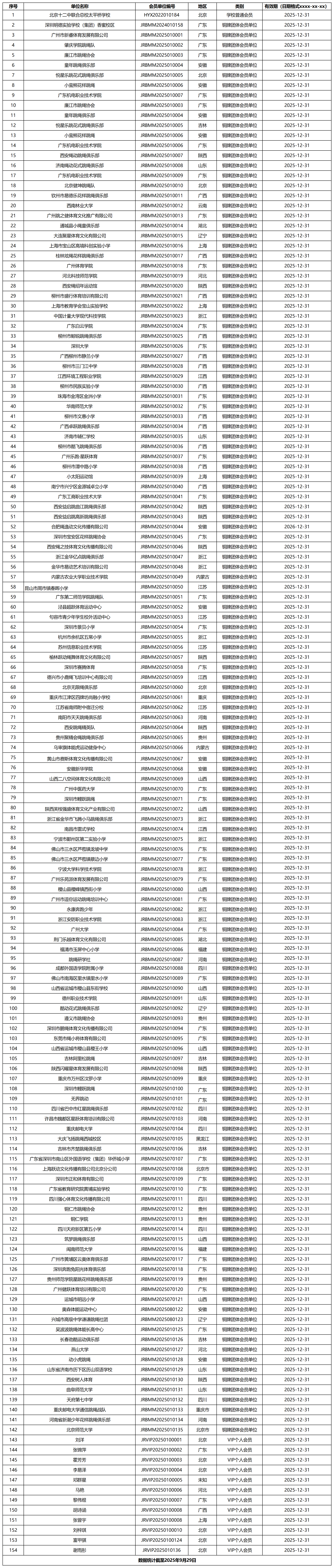 以上名单统计截止日期为2025年6月30日。其中,老版“学校普通会员”、“俱乐部普通会员”、“协会会员”直接对应新版“绳队友铜牌会员单位”;老版“学校理事会员”、“俱乐部理事会员”直接对应新版“绳队友银牌会员单位”老版“企业会员”直接对应新版“绳队友金牌会员单位”。如有遗漏,请各会员负责人及时与我们联系。我们将于次月初在中国跳绳官网更新名单。